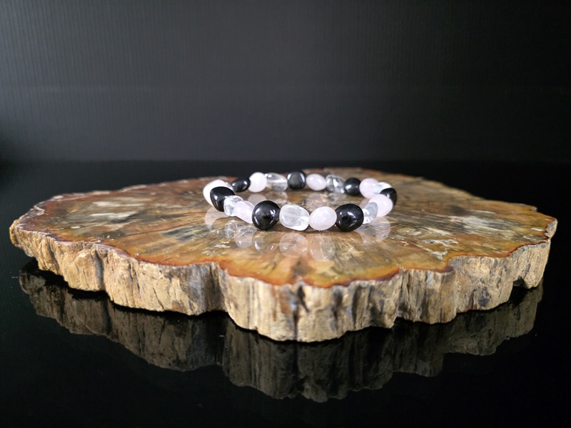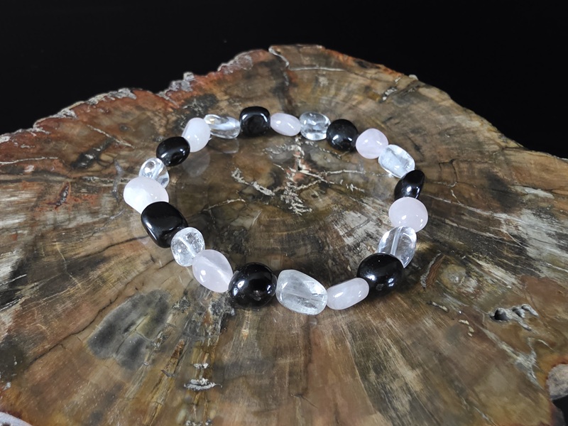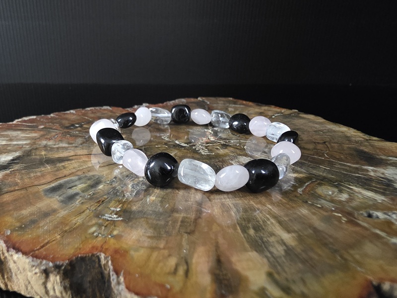 Narukvica izrađena od 3 kvalitetna minerala: Gorski kristal, rozenkvarc i crni turmalin.